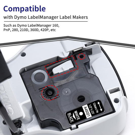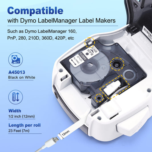 6-Pack Compatible Dymo D1 Label Tape 45013 Replace for DYMO Label Maker Refills a45013 S0720530, Black on White,1/2 Inch x 23 Ft for Dymo LabelManager 160 420P 210D 280 360D PnP Label Maker