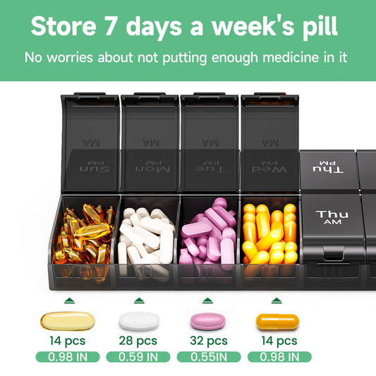 7 Day Extra Large Pill Organizer 2 Times a Day, Weekly Pill Box Twice a Day, XL AM PM Pill Case, Oversized Daily Medicine Organizer for Vitamin, Big Pill Container (Black)