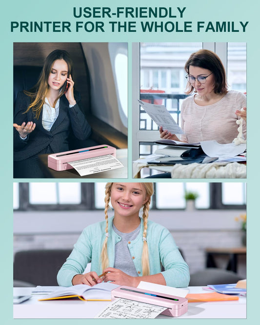 COLORWING Imprimante Portable A4 - Imprimante Bluetooth Thermique Mini Imprimante sans Encre Compatible avec Android et iOS et Ordinateur Prise en Charge de A4 Papier Thermique - Rose