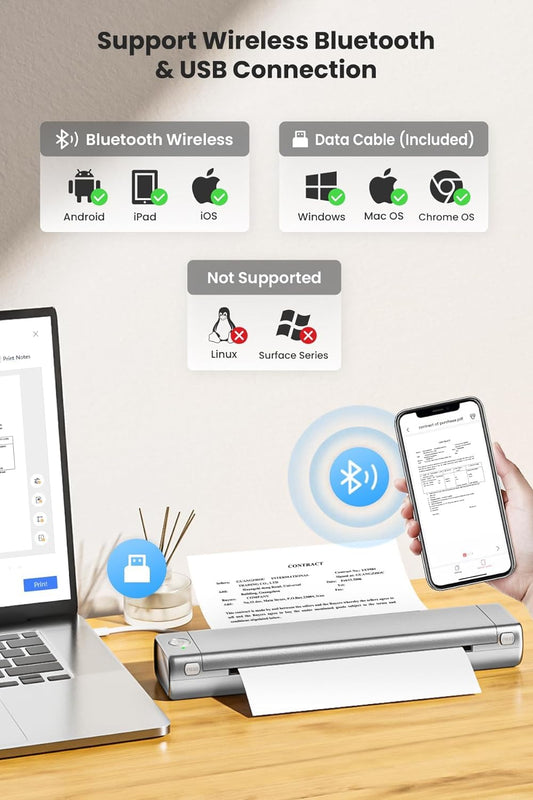 COLORWING Thermische Printer A4,M832 Draadloze Bluetooth Mobile Printer,Inktloze Printer Compatibel met Android en iOS,Bluetooth-printer,Klein,Compact,Grijs