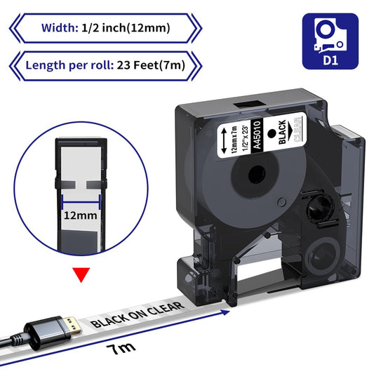 Compatible DYMO D1 Black on Clear Label Tape Replace for DYMO 45010 Label Maker Refills 1/2 Inch S0720500, 12mm x 7m for Dymo LabelManager 160 210D 280 360D, 3-Pack