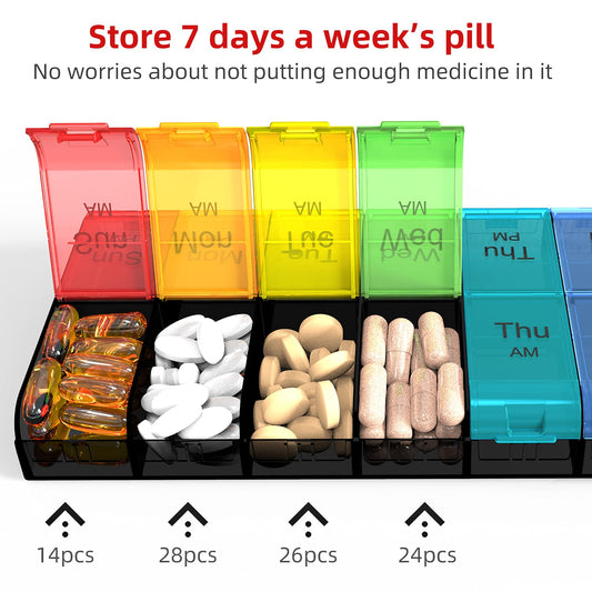 Extra Large Pill Organizer 2 Times a Day, Weekly XL AM PM Pill Case, 7 Day Pill Box Twice a Day, Oversized Daily Medicine Organizer for Vitamins, Big Pill Container, Medication Dispenser(Black&Rainbow)