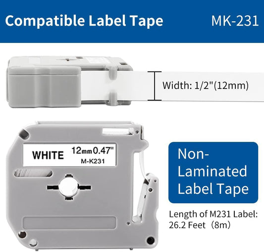 M-K231 Compatible with Brother P-Touch M Tape PT-M95 MK231 M231 12mm 0.47Inch label Maker Tape for Brother PTM95 PT-70 PT-90 PT-65 PT85, Black on White, 1/2'' x 26.2', 4-Pack